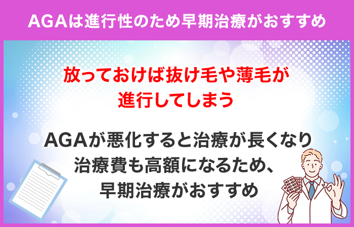 AGA(男性型脱毛症)は進行性の病気なので、なるべく早く治療を開始することが何よりも大切です。
