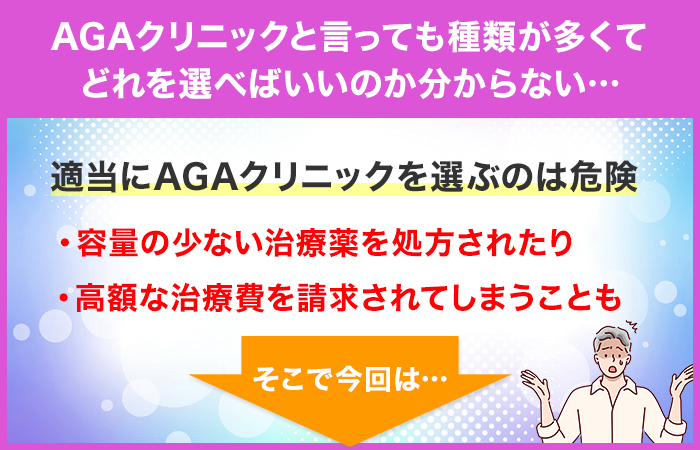 ですが、適当にAGAクリニックを選んでしまうと、容量の少ない治療薬を処方されたり、治療料金が高額になることも少なくありません。