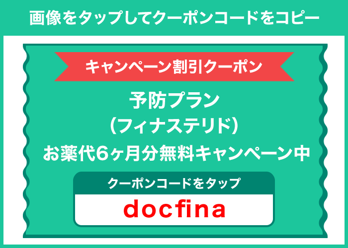 | 予防プラン | 月々1,000円(税込)* フィナステリド1mg お薬代6ヶ月分無料クーポン: docfina →予防プランはこちら |