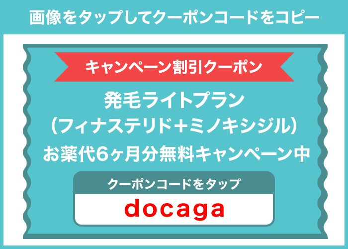 | 発毛ライトプラン | 月々1,861円(税込)* ・フィナステリド1mg ・ミノキシジル5mg お薬代6ヶ月分無料クーポン: docaga →発毛ライトプランはこちら |