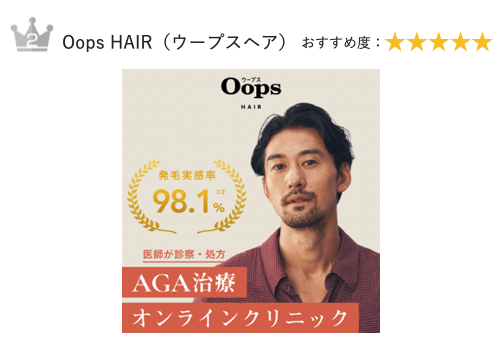 効果が高く続けやすいAGAオンラインクリニックおすすめ第2位は、発毛実感率98.1%を誇る『Oops HAIR(ウープスヘア)』です。