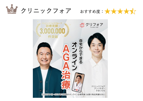 →クリニックフォアのAGA治療口コミ・評判!料金や効果、実際の体験談を徹底調査